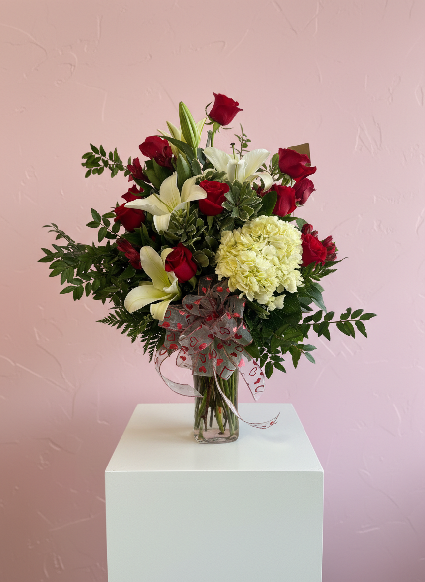 An arrangement featuring a dozen red roses, lily stems, and a lush hydrangea—elegant, romantic, and unforgettable.